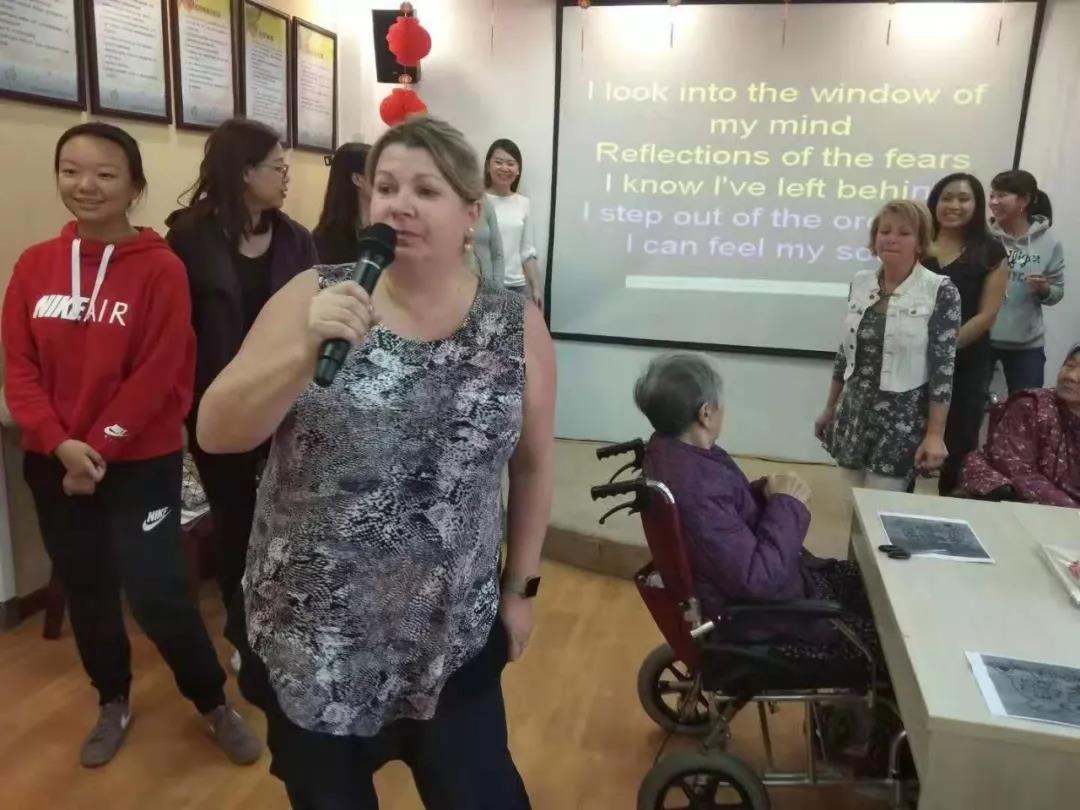 (志愿者在和老人唱英文歌曲)