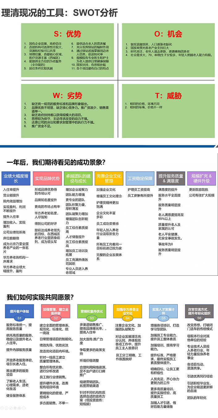 使用SWOT工具,在小组讨论中理清现状,分析企业当下的优势、劣势、外在机会与威胁。
