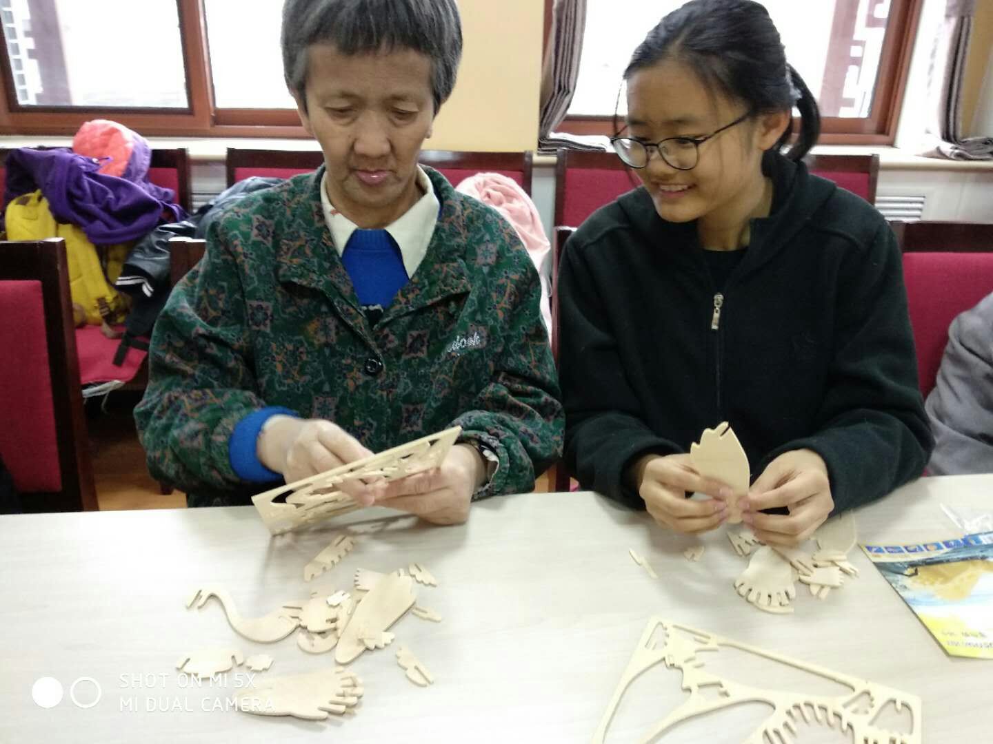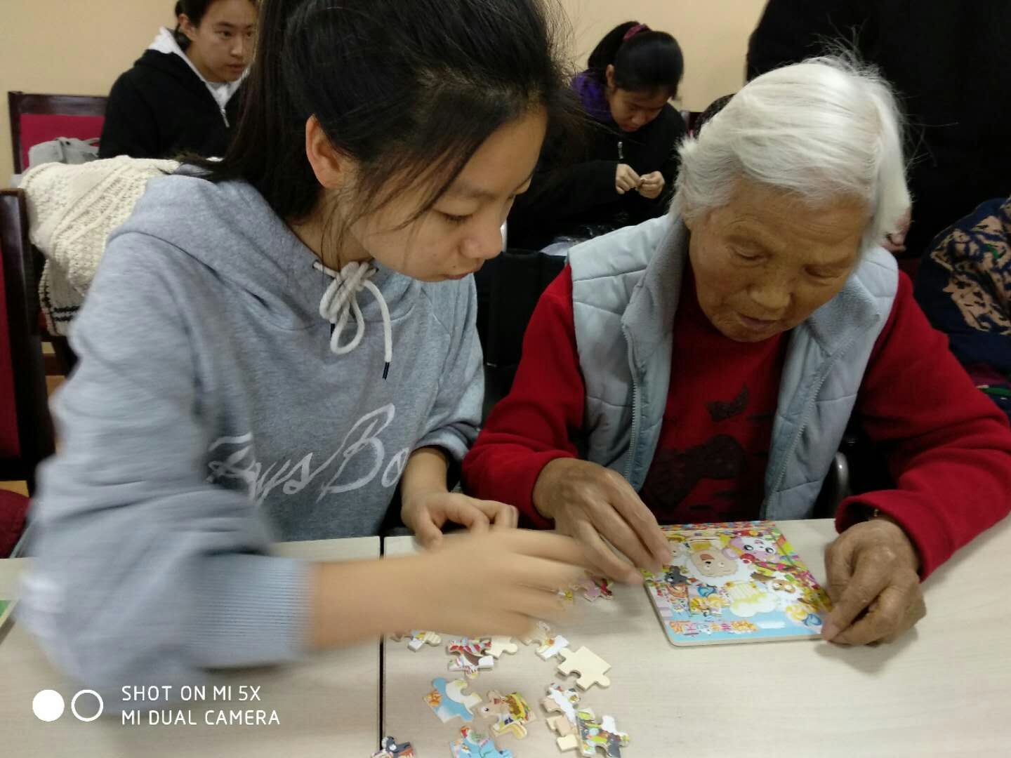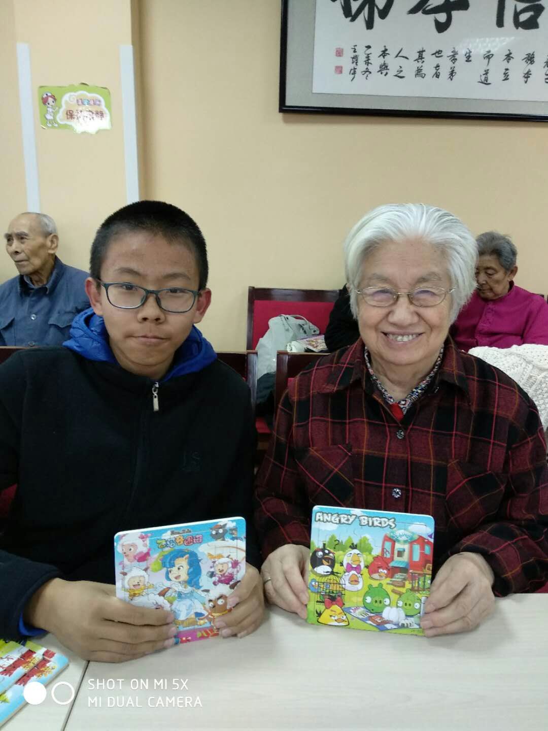 同学们和爷爷奶奶一起做手工、拼拼图、进行互动小游戏,有说有笑,老人们开心的不得了。