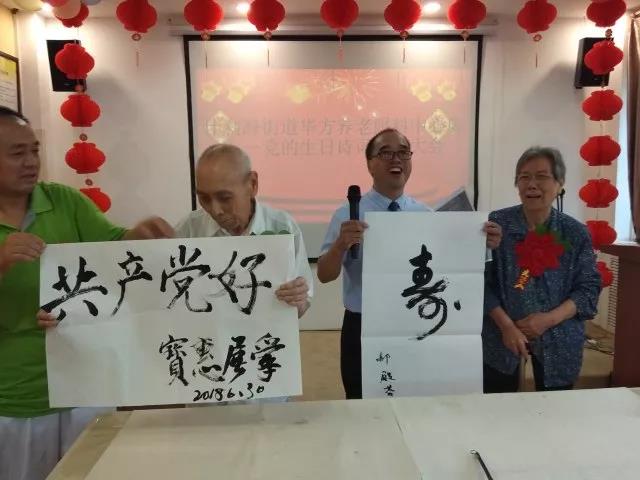 照料中心为每位老党员佩戴了大红花和党徽。老人们换上了节日盛装,一起参与了大合唱、独唱,书法表演,中心的老党员们还献上感人的《赞七一》、《共产党最亲》诗朗诵,深深地表达了对党的热爱,感染了在场的每一个人。