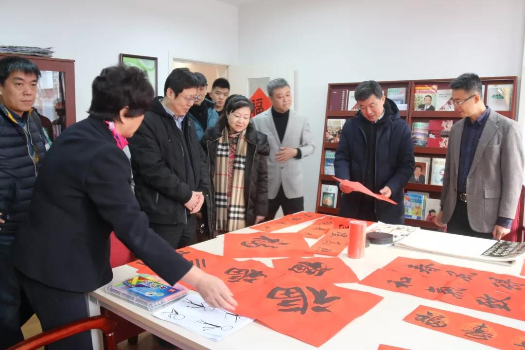 随后一行领导参观了阅览室,正巧中心的几位爷爷奶奶在写对联,对他们的作品称赞有加。